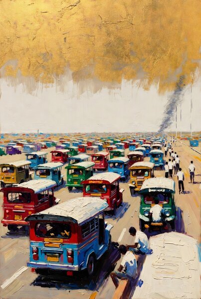 Der Streik begann im Morgengrauen. Über die Tausend Inseln hinweg — jenes weitläufige Archipel, wo siebzehn Provinzen sich aneinanderdrängen wie Passagiere in einem überfüllten Boot — saßen die Fahrer von Jeepneys und Dreirädern und Bussen in ihren geparkten Fahrzeugen und warteten. Sie protestierten nicht gegen den Krieg. Sie protestierten gegen den Treibstoffpreis, was dasselbe ist, ausgedrückt in der Sprache eines leeren Geldbeutels statt der Sprache der Geopolitik. Die schwarze Flüssigkeit, die ihre Motoren antreibt, stammt aus dem Golf, durchläuft eine Kette von Transaktionen, die Station Elf nie vollständig kartiert hat, und erreicht ihre Zapfsäulen zu einem Preis, der während siebenundzwanzig Tagen Bombardement über das hinausgestiegen ist, was ein vernünftiger Fahrpreis decken kann. Die Fahrer rechneten. Sie zogen die Treibstoffkosten vom erwarteten Tagesverdienst ab. Die Zahl, die übrig blieb, war weniger als nichts. Also hörten sie auf.
