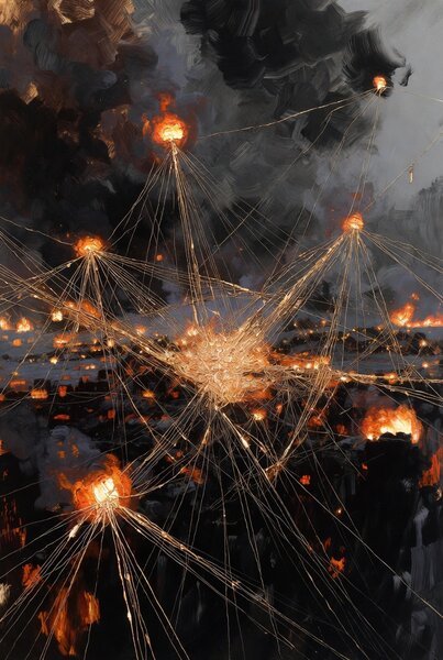 Meanwhile, the Flame Lands’ retaliation continues to spray outward like water from a burst pipe. Ten ballistic missiles struck the Star Compact overnight, injuring one hundred and twenty-four inhabitants in settlements near the coast. But the Flame Lands are not limiting their fury to the nations attacking them. Their Guardians launched drones and missiles at the Sand Kingdoms, striking a refinery called Ras Tanura — the single largest oil processing facility on the planet’s surface, through which half a million barrels of the black liquid flow each day. The refinery has shut down. Two interceptor drones were destroyed, but their debris started fires that burned through the night.