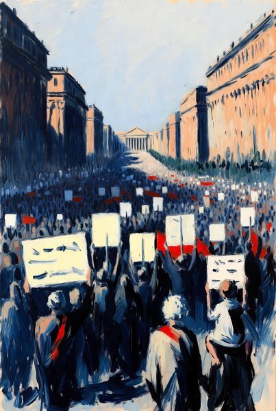 Ze marcheerden. In elke grote stad van de Adelaarsrepubliek, en in honderden kleinere, vulden de bewoners de straten in wat de diverse telmechanismen van het Signaalweb schatten als een van de grootste gelijktijdige demonstraties in de geschiedenis van de natie. De borden die ze droegen zeiden „Geen Koningen“ — een verwijzing, leidde Station Elf af, naar de steeds meer monarchale bestuursstijl van de Luide Bevelhebber, waarin uitvoerende bevelen wetgeving vervangen en loyaliteit competentie vervangt en het staatsapparaat met aanzienlijke inspanning wordt gebogen naar de voorkeuren van een enkel individu. De bewoners van de Adelaarsrepubliek hebben een gecompliceerde relatie met dit concept. Hun stichtingsmythologie is expliciet antimonarchaal — de natie werd tweeënhalve eeuw geleden gecreëerd in de daad van het afwijzen van een koning. En toch gedraagt de Bevelhebber zich, met toenemende transparantie, alsof hij er een is. De demonstranten merkten het op. Ze gebruikten het oudste woord in hun politieke vocabulaire om te benoemen wat ze zagen.